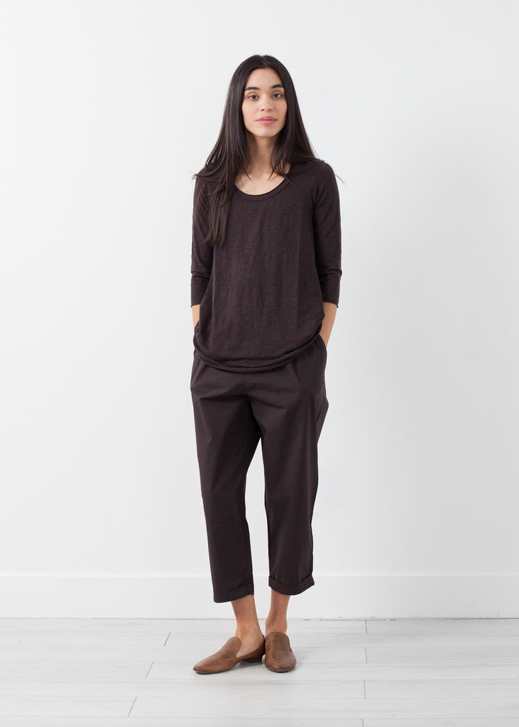 The Lietto Top is a heathered joy. This functional piece offers 3/4 inch sleeves, a scoop neckline, and raw hemline and cuffs. Labor.Art. Color Congo. 95% Linen, 5% Elastane. Made in Italy. Ashley is wearing a Size 0.