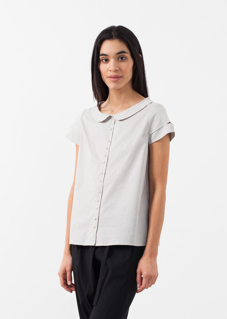 The Rudolf is a pretty top for any apparel needs. Button placket closure at front. Capped sleeves. Wide Peter Pan collar. Lilith. Color Fog. 67% Cotton, 33% Anidex. Ashley is wearing an X-Small.